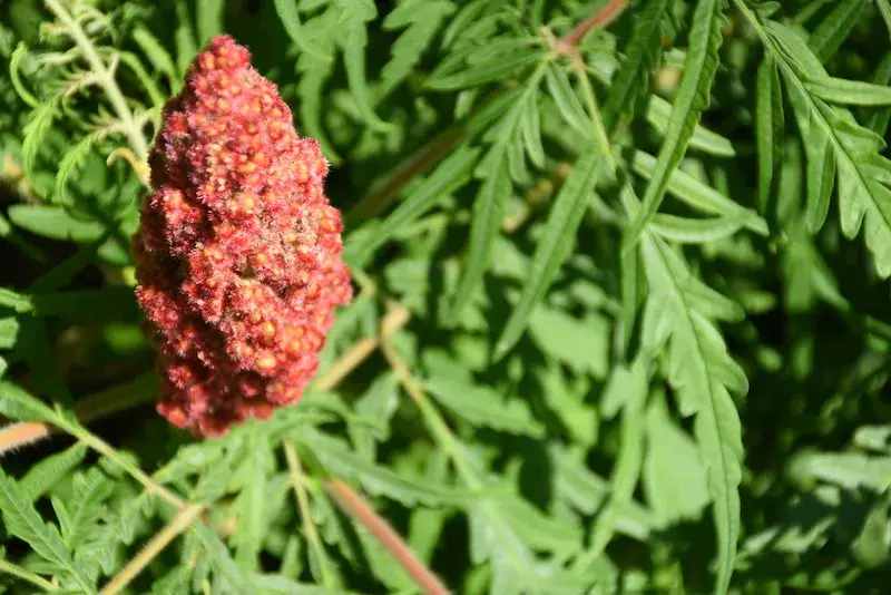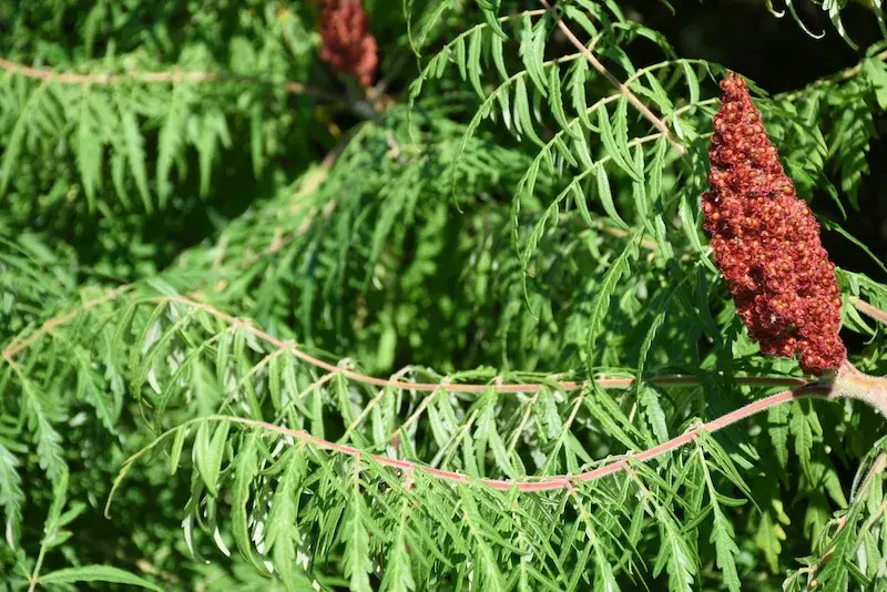 Nel corso di un recente matrimonio gli invitati, passeggiando nel parco, ci hanno chiesto se vi è qualche pianta simbolo del giardino. Alcune svettano come i grandi Cedri Deodara o la possente quercia rossa che con le proprie foglie infiamma l’autunno. Ma li vedi, sono alti decine di metri. Poi, un po’ più in qua, un enorme cuscino. Un gigante in orizzontale disteso fra le colline. E’ un Sommaco Maggiore, detto anche Sommaco Americano. Rhus Typhina, varietà ‘ Dissecta’ originaria del Nord America. Scomodando il caro vecchio ‘raggio x raggio x 3,14‘ si ricavano più di 500 metri quadrati di pianta. Vuoi vedere che soffia la pole ai due imponenti compagni? Non scherza, la Thypina. Al suo interno un micro mondo di uccelli, ricci, fagiani. Verrebbe da cercarne altre di così in grandi in giro per il mondo.