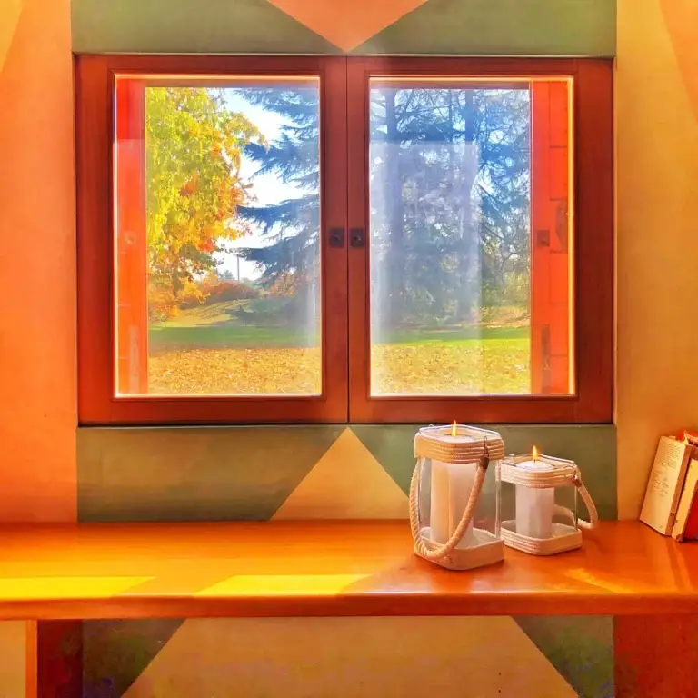 No, non è un fotomontaggio. Gli alberi sono così vicini alla villa che la luce bassa dell’alba disegna ombre sull’intera parete est. Fuori i salottini