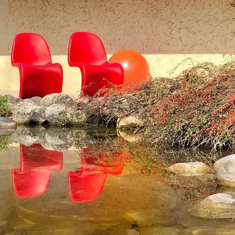 Accomodatevi. Le iconiche Panton chairs (rigorosamente rosse) popolano la villa e si preparano ad ricevere i vostri lati B 🙂 . Prodotte da Vitra alla