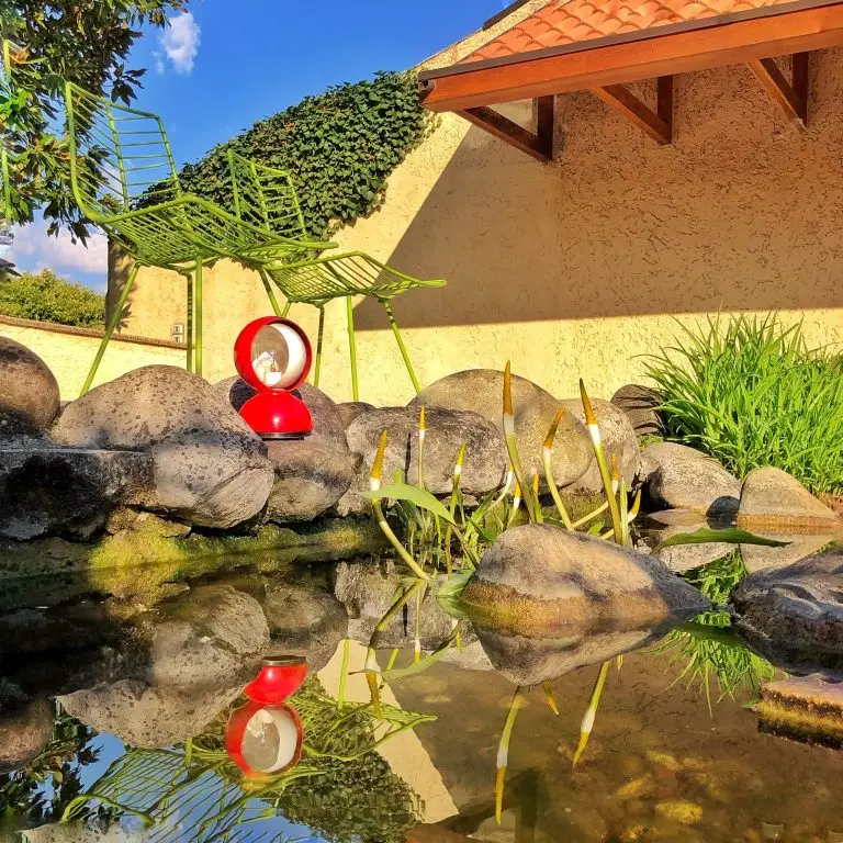 Residuato dell’allestimento per la festa di ieri sera. Come Narciso, l’Eclisse di Magistretti (1965) si specchia nello stagno. Perché la nostra villa è diversa? Perché