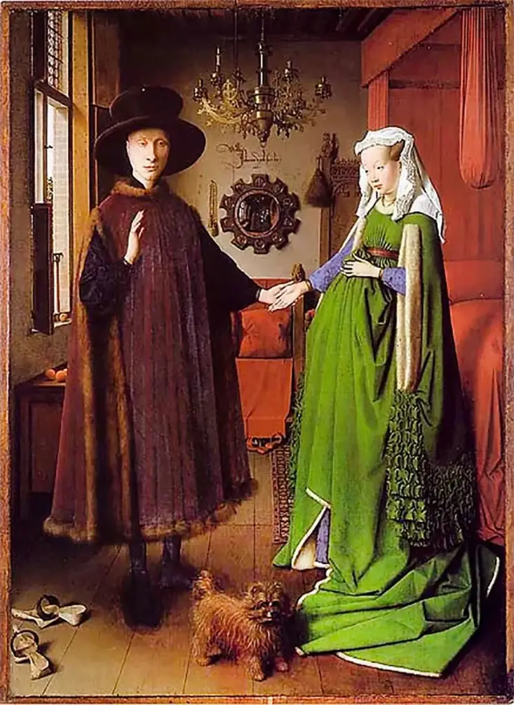 Con le colline ed i grandi cedri sullo sfondo, i due Podenco, antichi cani delle isole Canarie, accompagnano Eleonora e Paolo freschi sposi. Ma invece di rimirarvi nel celebre specchio convesso per il quale il dipinto è famoso, qui dovrete ‘accontentarvi’ di una Maserati.