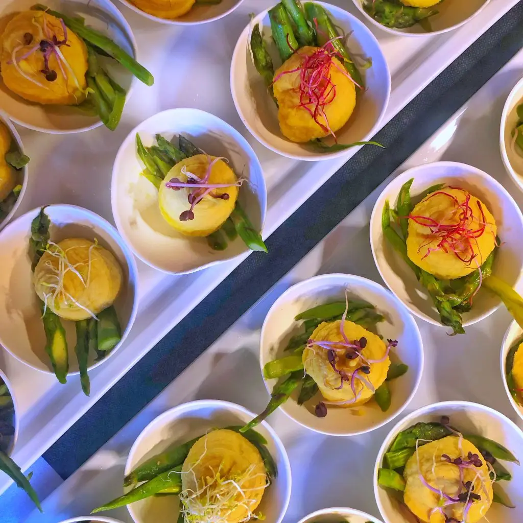 Antipasto di angus, tortino di asparagi, risotto sempre agli asparagi, ravioloni burrata e pomodori confit, maialino allo zafferano e verdurine. Per finire tortino di cioccolato e ciliegia.